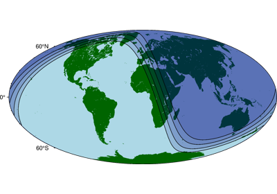 This method plots the day-night terminator. Alternatively, it can plot the terminators for civil twilight, nautical twilight, or astronomical twilight.